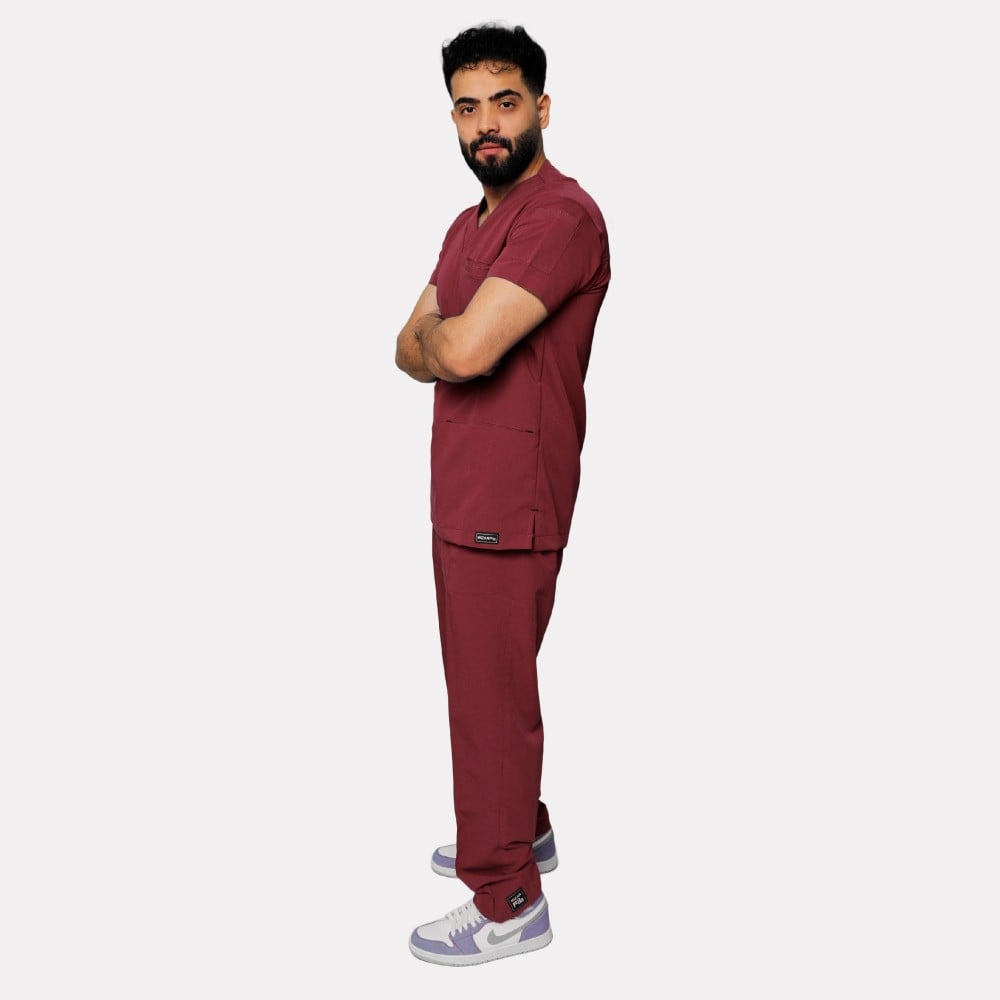 يتوفر سكراب رجالي عنابي بتصميم عصري يناسب جميع الأذواق. يأتي مع تفاصيل دقيقة مثل الأزرار المريحة، والجيوب المتعددة لتخزين الأدوات الطبية بسهولة. بالإضافة إلى أن الخامة المصنوعة منها السُكراب تمنحك تهوية جيدة طوال اليوم، مما يساعد في الحفاظ على راحتك وراحتك أثناء العمل.